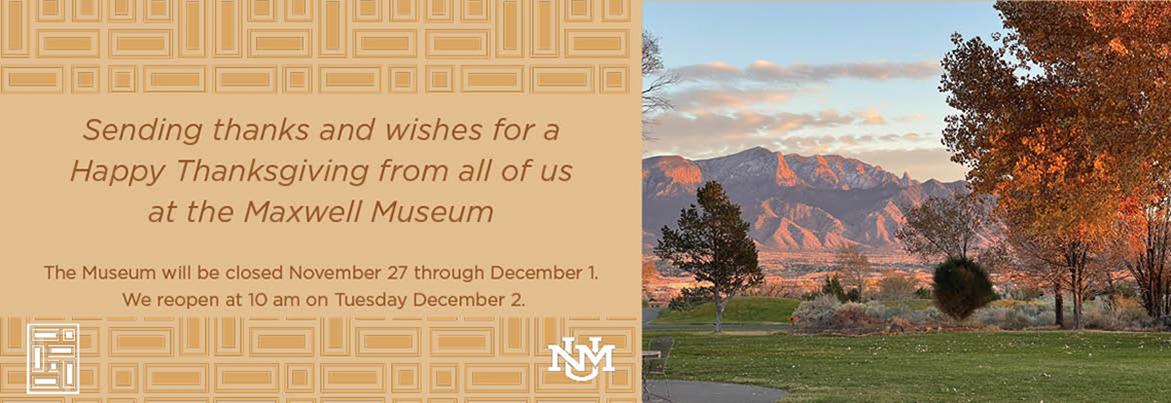 The University of New Mexico and the Maxwell Museum of Anthropology sit on and among the traditional homelands of multiple sovereign nations. We acknowledge the deep connections of the Pueblo, Diné, and Apache peoples to the land and the significant contributions of past, present, and future Indigenous peoples and communities to life and culture in the greater Southwest, the United States, and the world at large. In acknowledging these connections, we express our gratitude for the opportunity to live, work, and learn on this land. We honor our relationships with Indigenous peoples and commit to working towards reconciling injustices, restoring voices, and realizing community going forward.